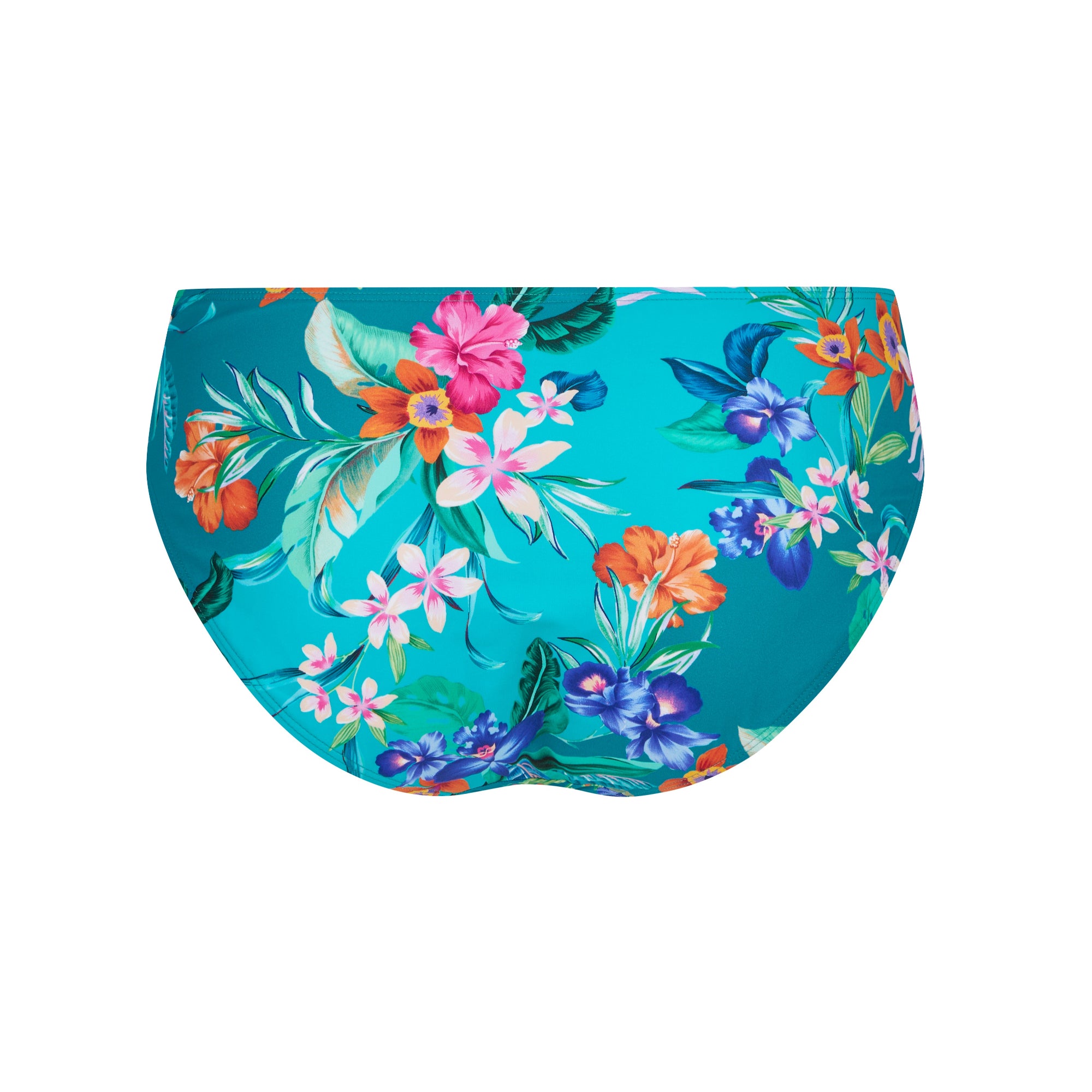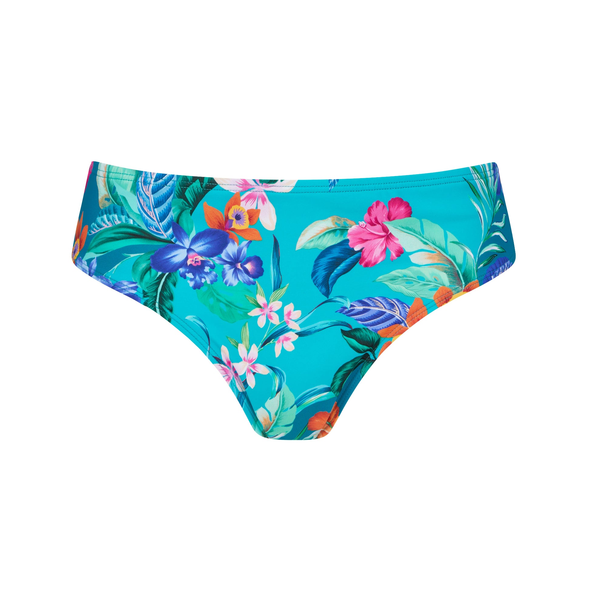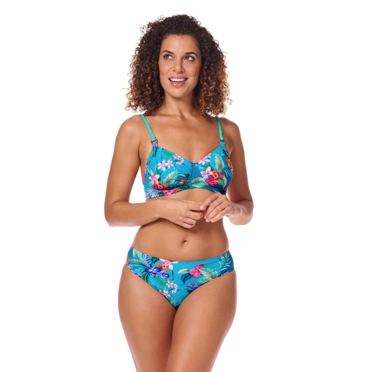 Dessa stilfulla bikinitrosor från Amoena kombinerar elegant design med funktionalitet. Det livfulla tropiska mönstret i blått, grönt och rosa ger en fräsch och somrig känsla, perfekt för soliga dagar vid stranden eller poolen.