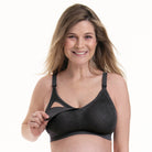 Anita amningsbh i färgen antracit är en sömlös amnings-bh utan byglar, skapad för att ge stabilt stöd och en mjuk känsla mot huden under graviditet och amningsperiod. Modellen har en smidig knäppning framtill som går att öppna och stänga med en hand, vilket gör den praktisk i vardagen. Den bredare formen runt om och de bekväma axelbanden ger en jämn passform som fungerar lika bra dagtid som när du vill ha en skön bh att sova i.