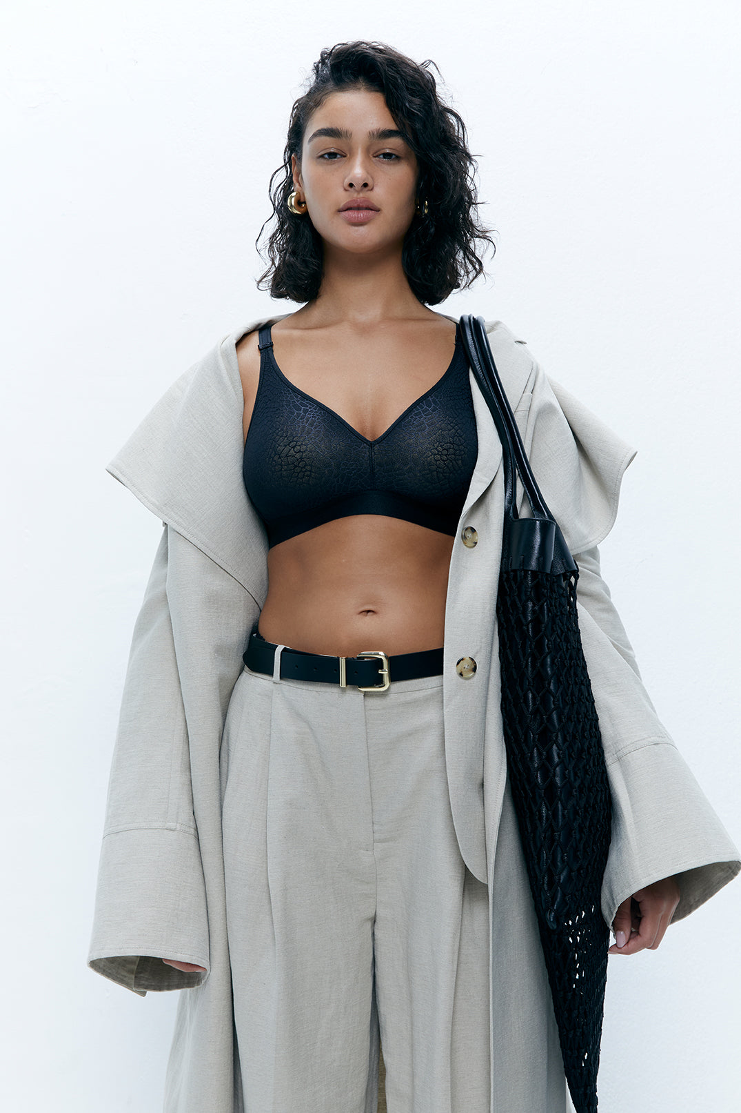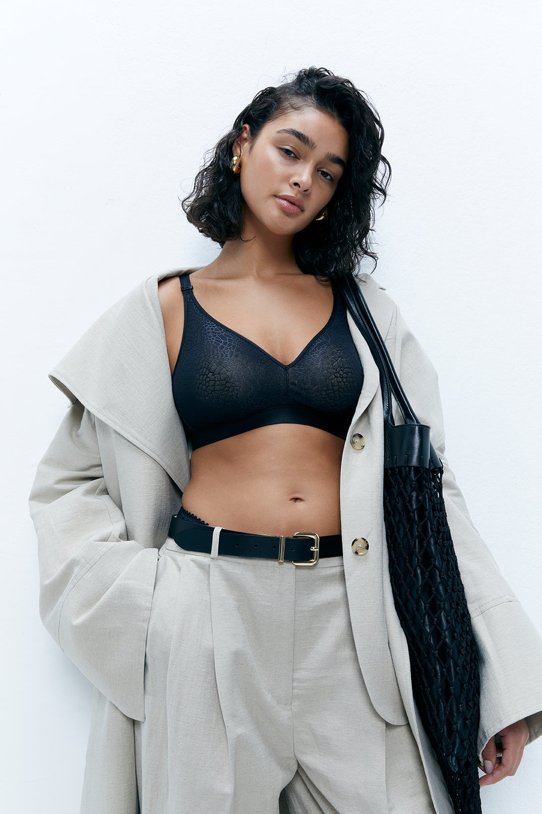 Denna bygellösa BH är designad för att ge en naturlig siluett med sin formpressade kupa, som smidigt anpassar sig efter din kropp för en elegant och sömlös passform. Tillverkad med Chantelles exklusiva materialteknik, erbjuder denna BH en lyxig känsla samtidigt som den är lätt och andas. Perfekt för större kupor, ger den en minimizer-effekt som skapar en balanserad och smickrande form. Justerbara axelband och en mjuk, stödjande ryggpanel gör denna BH idealisk för vardagsbruk, och den stilrena designen gör den till ett oumbärligt tillskott i din underklädesgarderob.