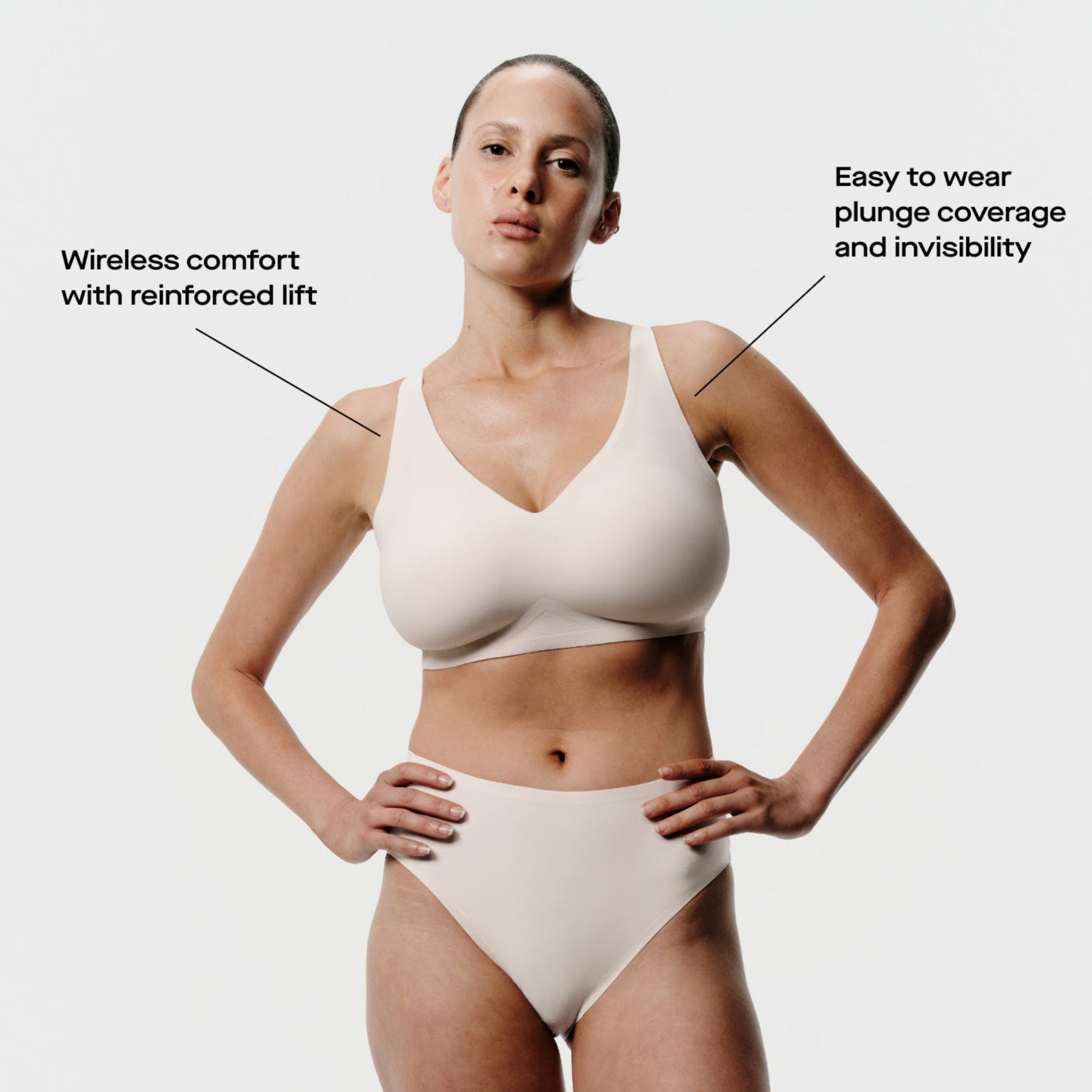 Med djup plunge-ringning, tunna justerbara axelband och fastsydda adaptiva kupor är detta en BH som både är bekväm och stilren. Den osynliga designen med släta sömmar gör den perfekt under tajta eller tunna kläder.
