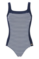 Damella Claire Baddräkt Navy/White är en klassiskt randig baddräkt med smickrande kontrastfärgade sidopartier som ger en formande silhuett. Modellen har bystsupport och mjuk vaddering som ger ett behagligt stöd, samtidigt som powernet i framstycket bidrar till en lätt shapingeffekt över magen. Det randiga seersucker-materialet framtill ger struktur och ett marint uttryck som passar fint både vid poolen och på stranden.