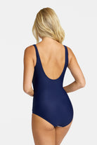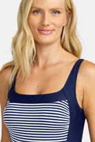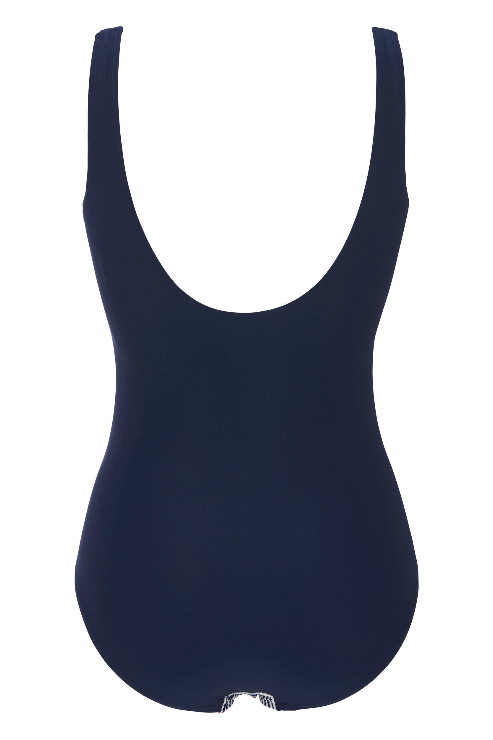 De bredare axelbanden och den stabila passformen gör modellen bekväm att bära under hela dagen. Kombinationen av navy och vitt ger ett klassiskt badplagg som är lätt att trivas i säsong efter säsong.