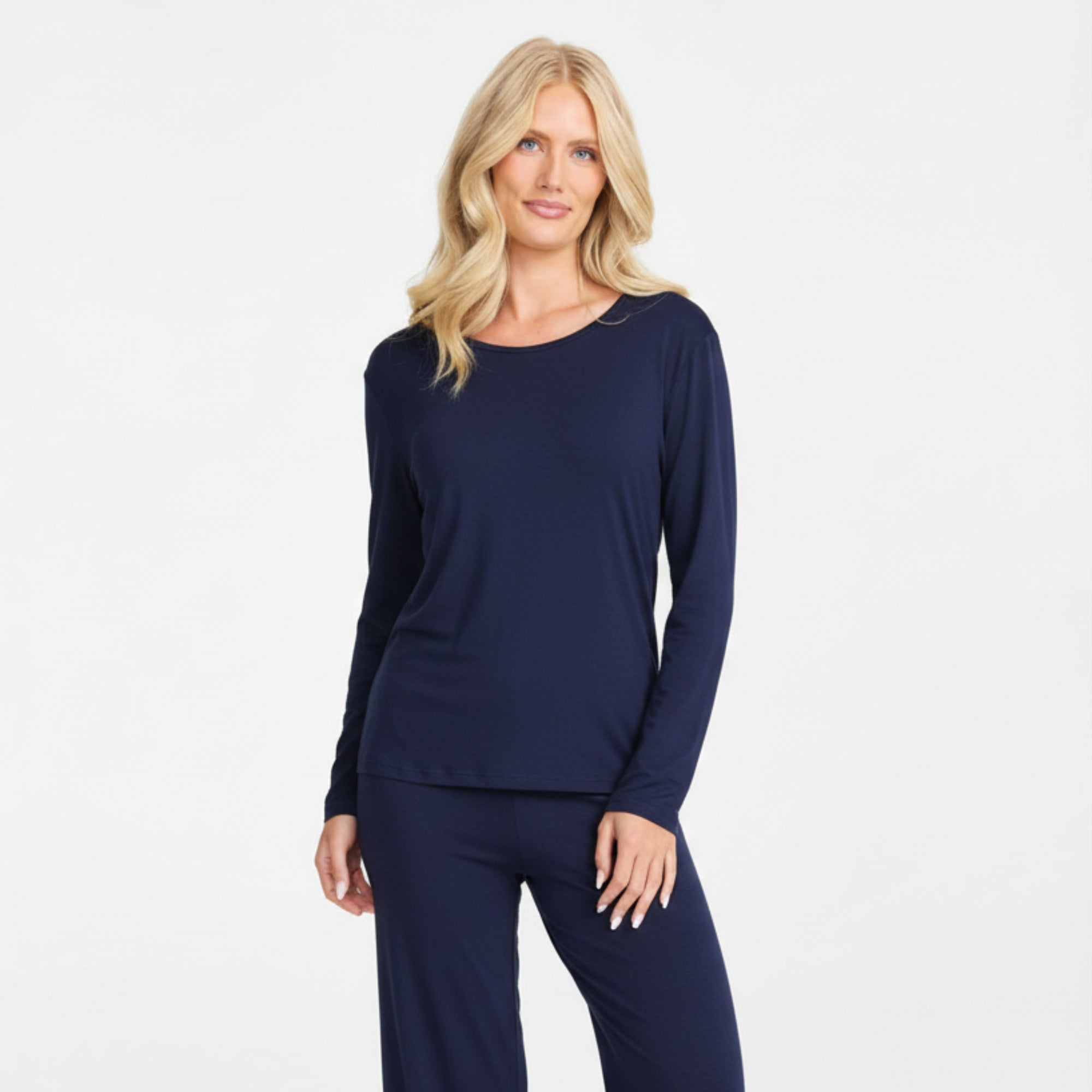 Damella bambu T-shirt med lång ärm i marinblått är ett mjukt och följsamt basplagg som passar perfekt både som underställ, hemmatröja eller till vardags. Tillverkad i lyxig bambuviskos som känns extra skonsam mot huden och ger en behaglig komfort hela dagen. Den rundade halsen och den rena designen gör tröjan lätt att matcha, medan den elastiska kvaliteten ger en fin passform utan att sitta åt.