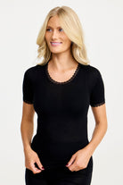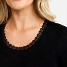 Klassisk och elegant topp från Damella i färgen svart, tillverkad i en lyxig blandning av extrafin merinoull och siden. Den mjuka kvaliteten gör den både skön och temperaturreglerande – sval när det är varmt och värmande när det är kallt.