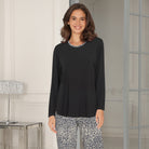 Pyjamasen består av en långärmad tröja med rundad nederkant för en feminin passform samt byxor med resår vid benslut för en skön och säker känsla. Den lösa modellen gör den extra bekväm att bära, både på natten och som myskläder hemma.