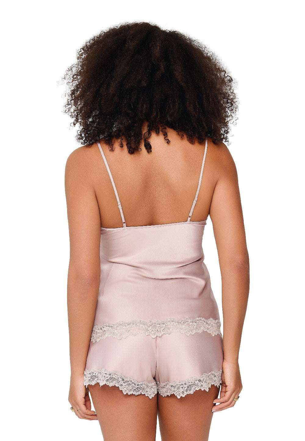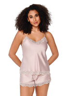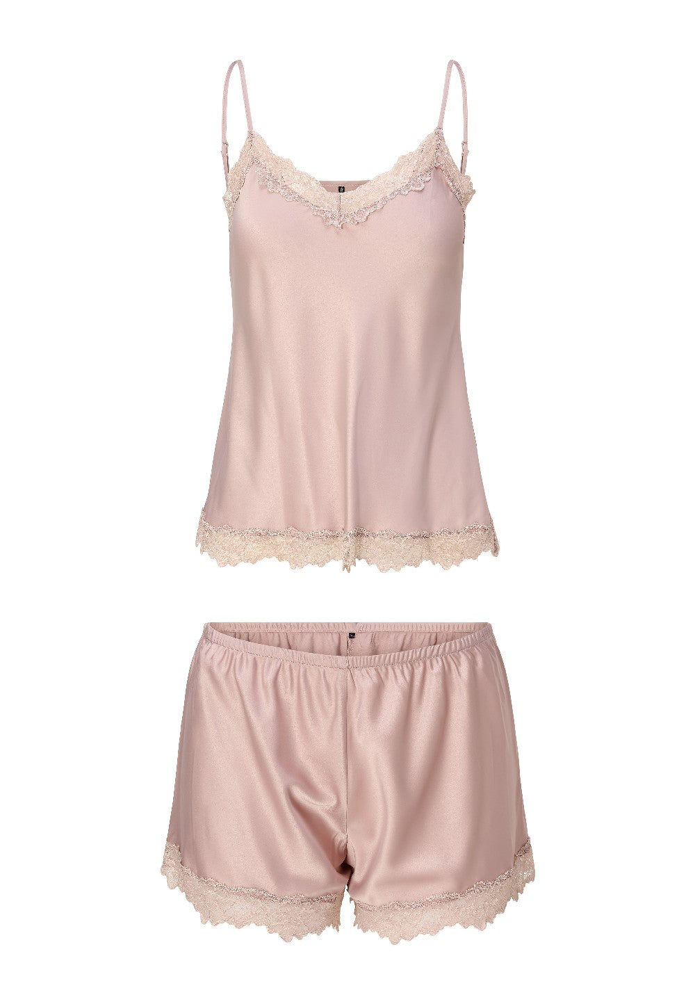 Toppen har tunna, justerbara axelband och är dekorerad med vacker spets längs både ringning och nederkant. De matchande shortsen har en elastisk midja för optimal komfort och avslutas med samma fina spetsdetaljer som skapar en harmonisk och feminin helhet. Det mjuka satinmaterialet ger en elegant glans och en lyxig känsla mot huden.