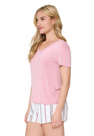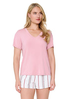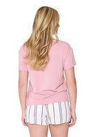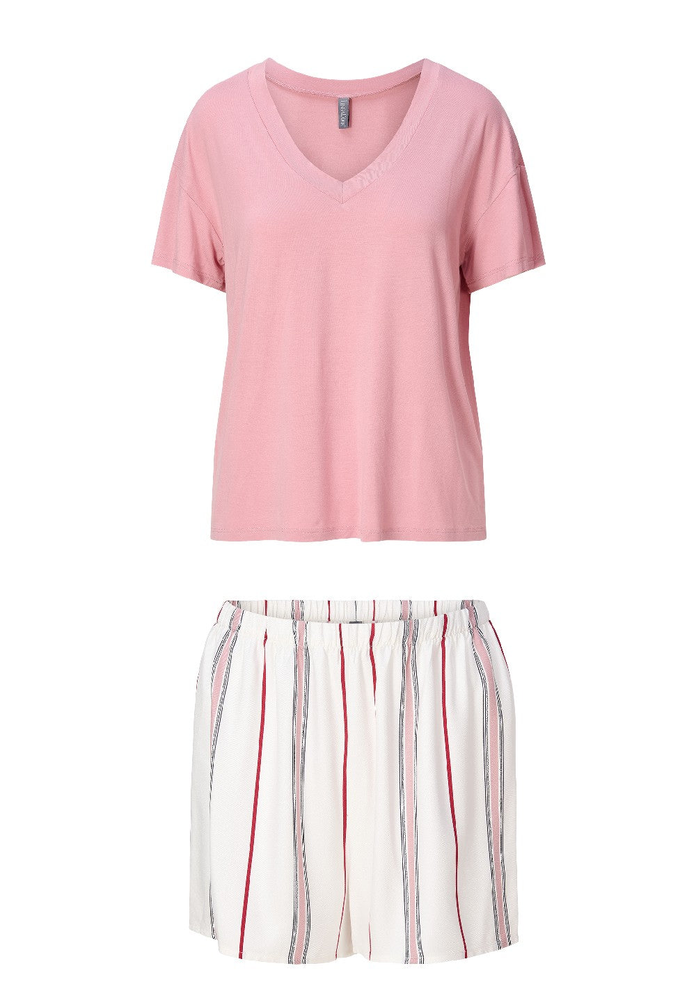 Upplev ett luftigt och somrigt shortama-set perfekt för varma dagar och sköna nätter. Summer Stripes består av en mjuk, enfärgad V-ringad topp med härligt följsamt fall samt ett par lösa shorts i ett stilrent randigt mönster. Shortsen har elastisk midja som ger en bekväm och flexibel passform – idealiskt för både vila och avslappnade hemmadagar.