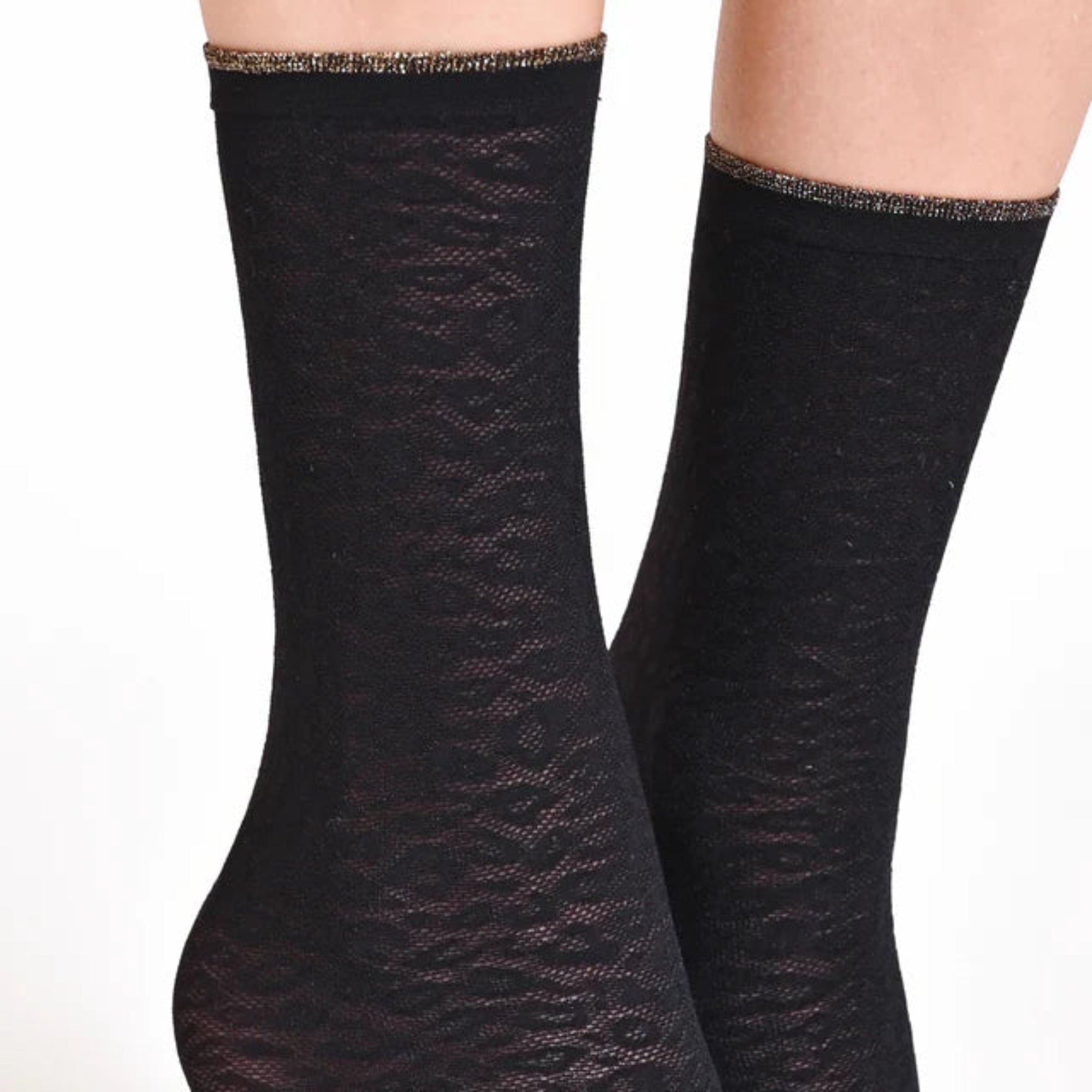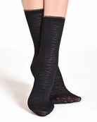 Upplev elegans och komfort i varje steg med Philippe Matignon Calzino Maculato. Dessa svarta strumpor är designade med ett diskret djurmönster som ger en trendig look – perfekta för både vardag och fest. Den metalliska tråden vid resåren ger en glans som lyfter hela outfiten.