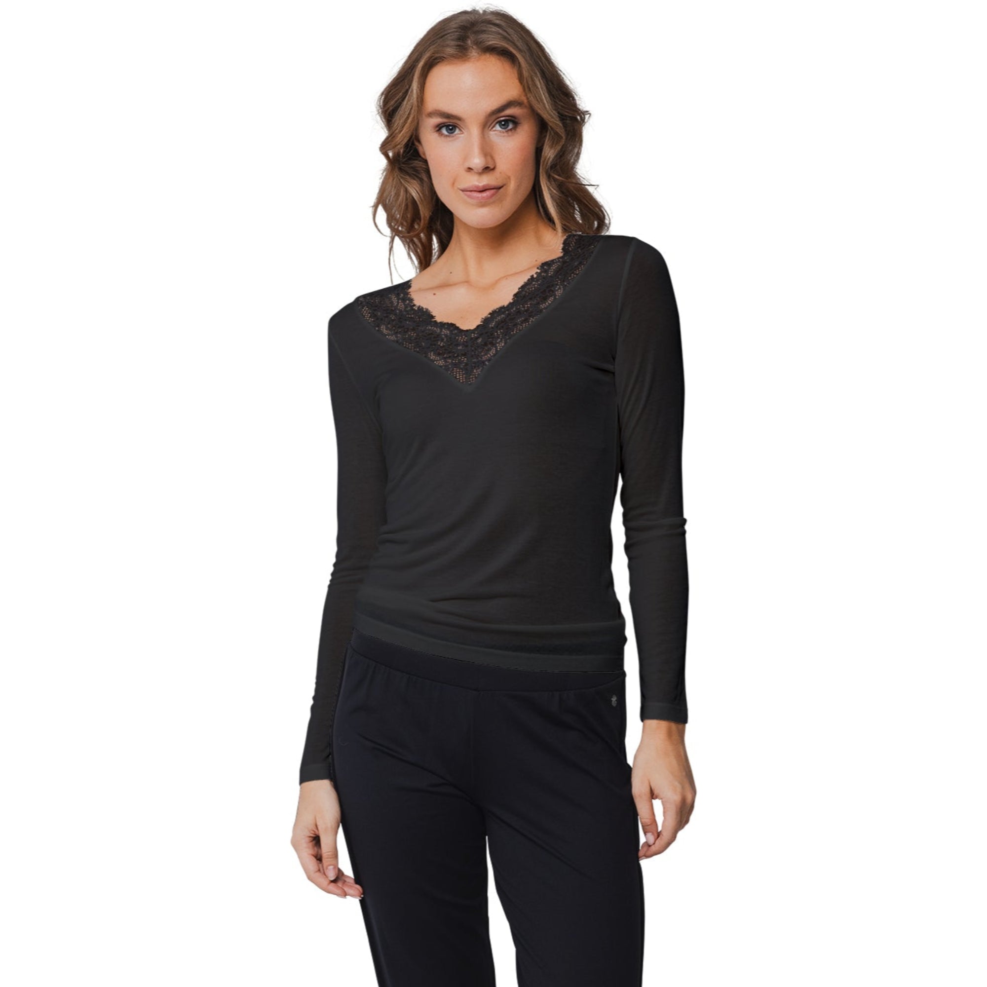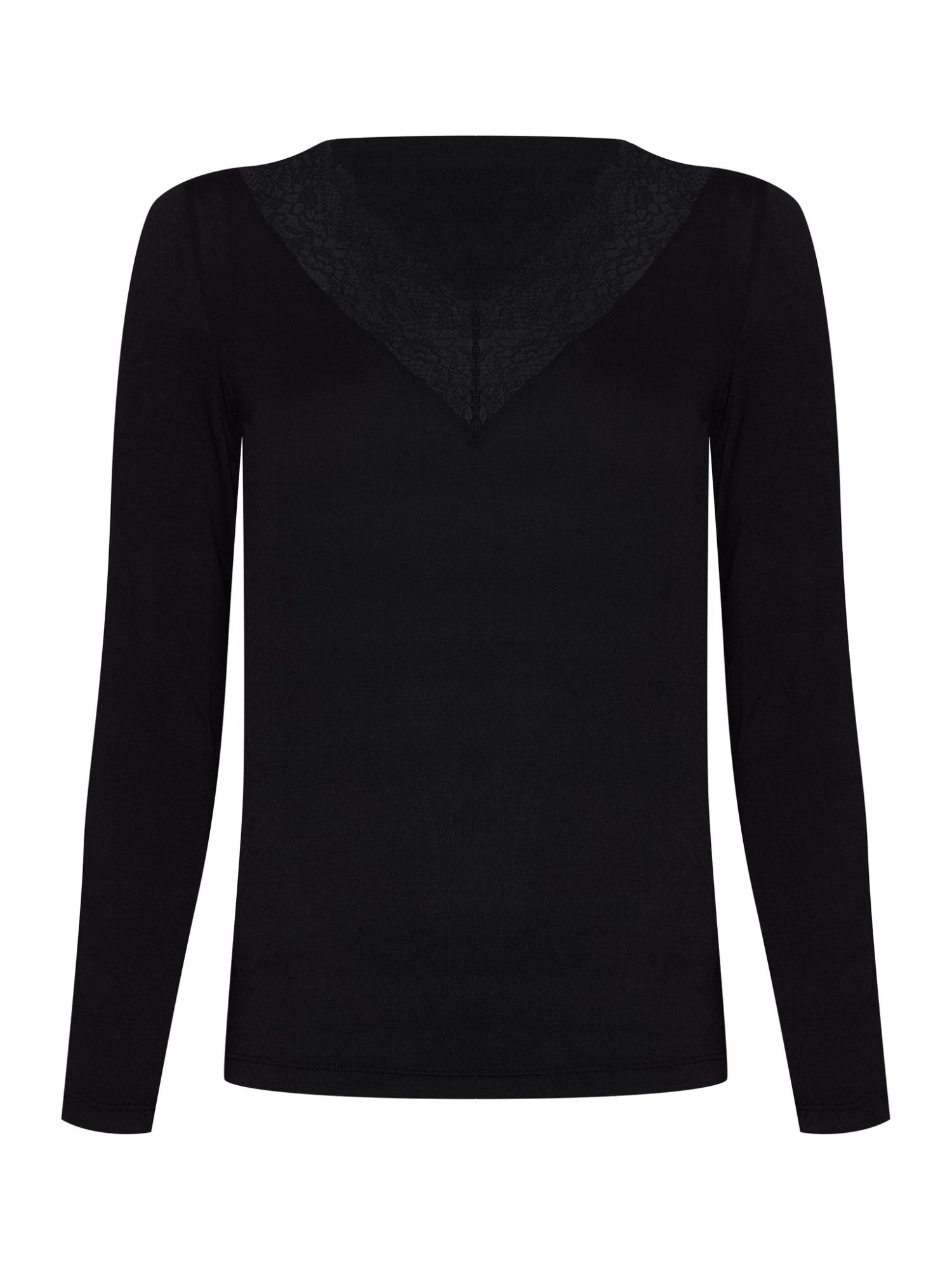 Den här långärmade toppen är en perfekt mix av stil och komfort. Med sin mjuka, stretchiga kvalitet i modal, ull och elastan följer den kroppens rörelser och ger en följsam, skön känsla hela dagen. Den eleganta spetsen ger ett feminint lyft till en annars enkel bas – lika fin att bära som den är, som att styla under en kavaj eller kofta.