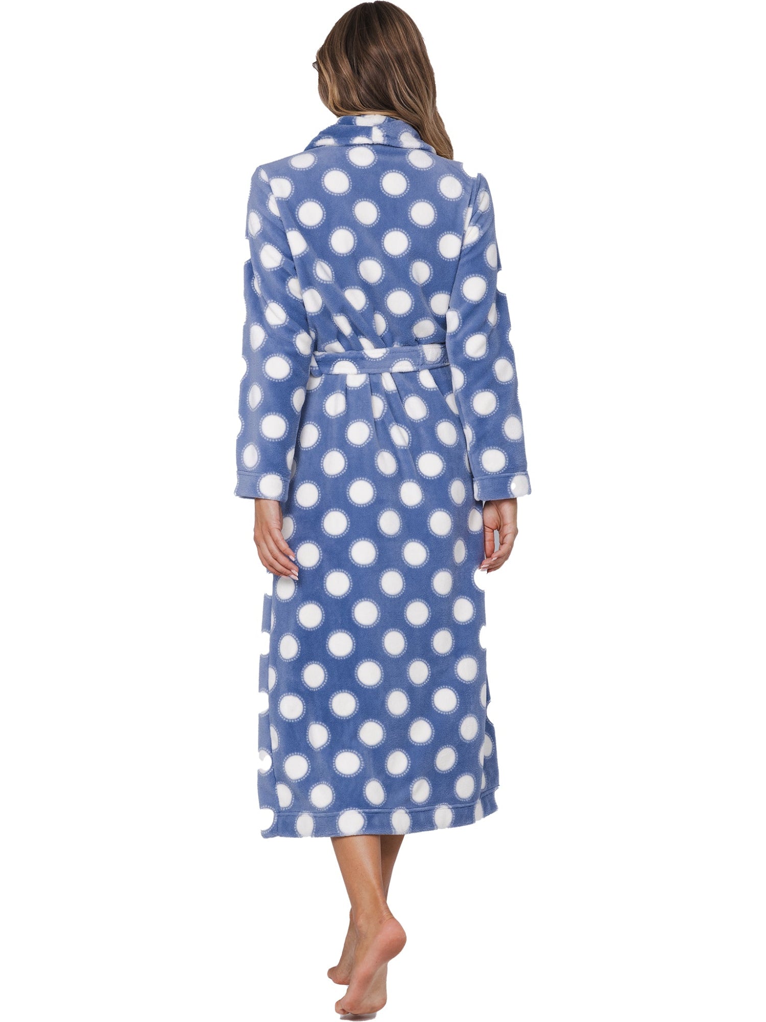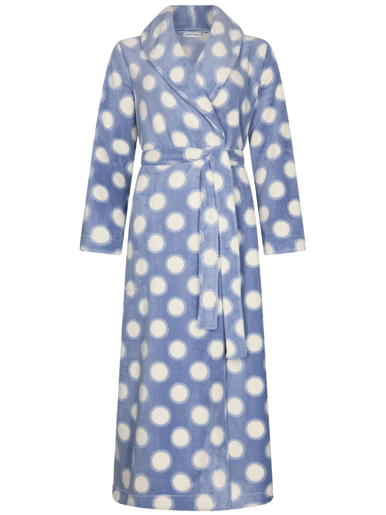 Känn dig både bekväm och fin i denna långa, mjuka morgonrock i blått med vita prickar. Med en längd på 130 cm sveper den skönt om kroppen och håller dig varm under kyliga morgnar och kvällar. Perfekt för att starta dagen i lugn och ro – eller för att avsluta den på bästa sätt.