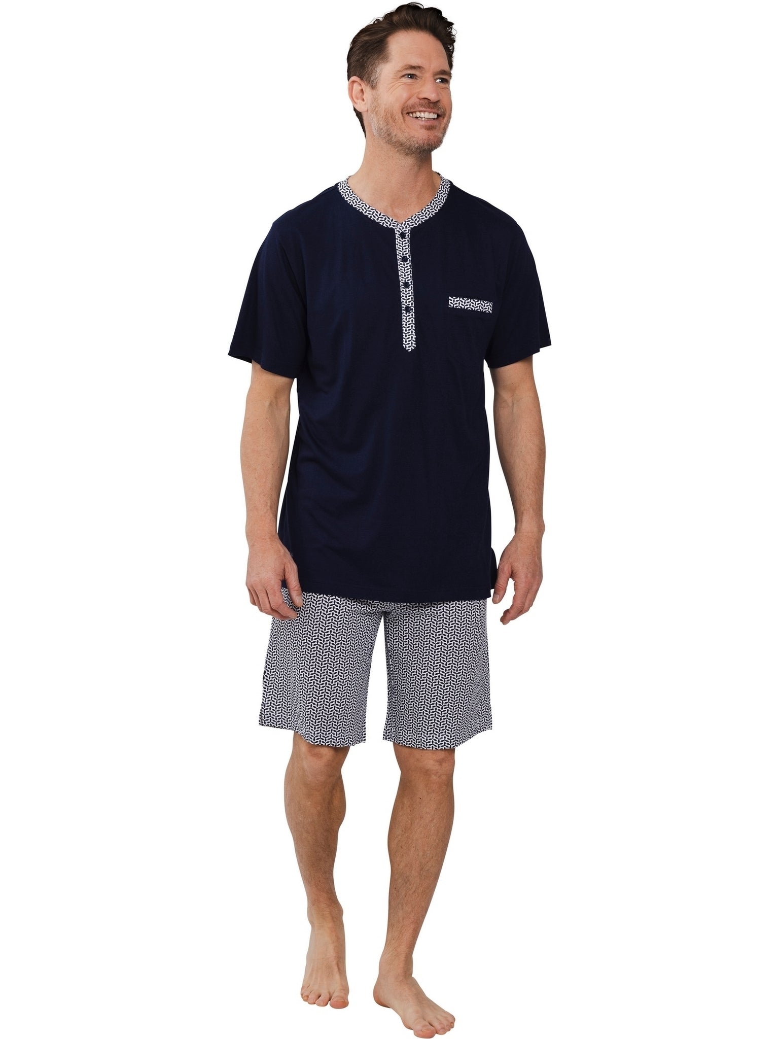 Upptäck en kort pyjamas som kombinerar enkel elegans med överlägsen komfort. Perfekt för varma nätter, erbjuder denna kortärmade pyjamas en avslappnad stil med knappförsedd topp och matchande shorts. Tillverkad av en högkvalitativ blandning av bomull och modal, känns den mjuk och sval mot huden.